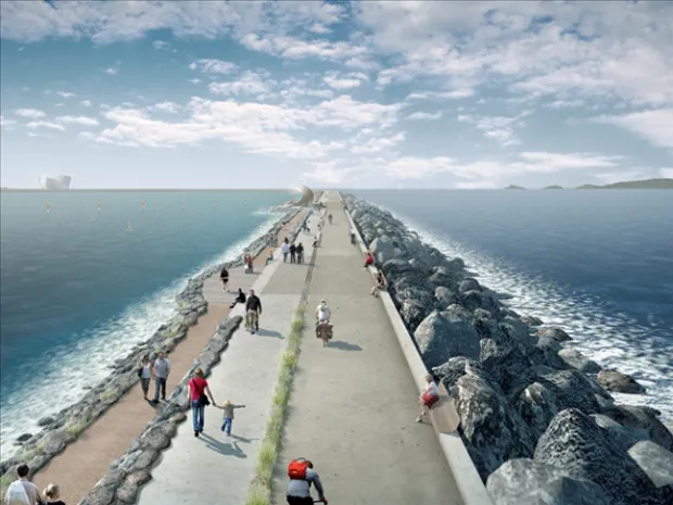 计划中的休闲步道的渲染图,将包含在斯旺西湾潮汐潟湖中。感谢潮汐潟湖斯旺西湾有限公司仍然有一个主要的障碍:成本。斯旺西的潮汐潟湖建设成本为10亿英镑(大约15亿美元)。在120年的使用寿命内,该工厂可能会收回投资,但其生产的电力成本将需要政府补贴长达35年。这将使潟湖获得比目前在英国风能或太阳能中可用的任何补贴都要高的补贴——这是一个很大的要求。究竟需要多少补贴目前正在讨论中,尽管政府在6月同意了潟湖的规划许可,但他们已推迟了建设的开始,至少到2017年。
