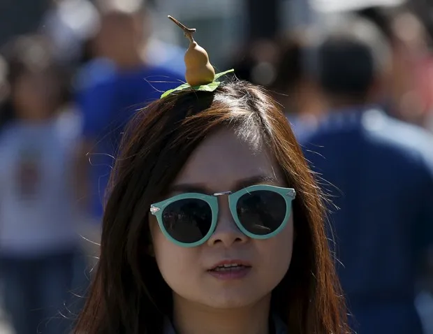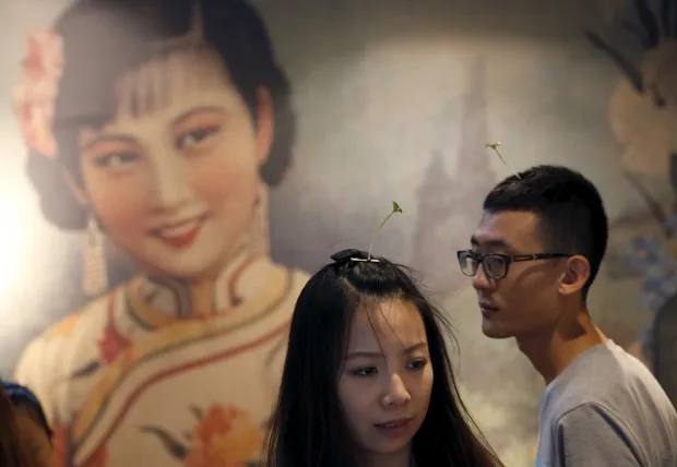 “我认为这更多来自西方文化,”在南方一所大学就读的学生邱传欢说,他正在北京访问。他在南锣鼓巷漫步时,头上戴着两根豆芽和一个葫芦,这里曾是一个时尚的社区,现在被游客和头饰商贩淹没。