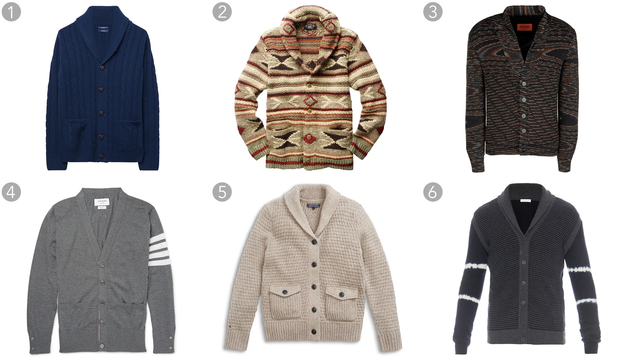 (1) 羊毛绳索披肩开衫,Gant,$275,gant.com; (2) 手工编织西南图案开衫,RRL & Co.,$995,ralphlauren.com; (3) 图案开衫,Missoni,$1,540,missoni.com; (4) 条纹羊毛开衫,Thom Browne,$995,mrporter.com; (5) 纹理披肩领开衫,Tommy Hilfiger,$199.50,tommy.com; (6) 提花羊绒开衫,Tomas Maier,$1,787,matchesfashion.com.