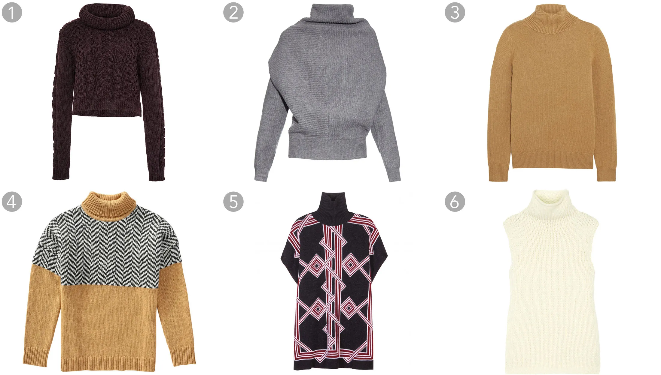 (1) 酒红色羊毛混纺缆绳针织套头衫,Tibi,$525,modaoperandi.com; (2) Jacy高领毛衣,Acne Studios,$483,matchesfashion.com; (3) 标志性羊绒毛衣,Chloe,$995,net-a-porter.com; (4) 锯齿毛衣,$49,joefresh.com; (5) 印花羊毛高领毛衣,Kenzo,$677,mytheresa.com; (6) Vandrona羊驼混纺高领毛衣,Theory,$375,net-a-porter.com。