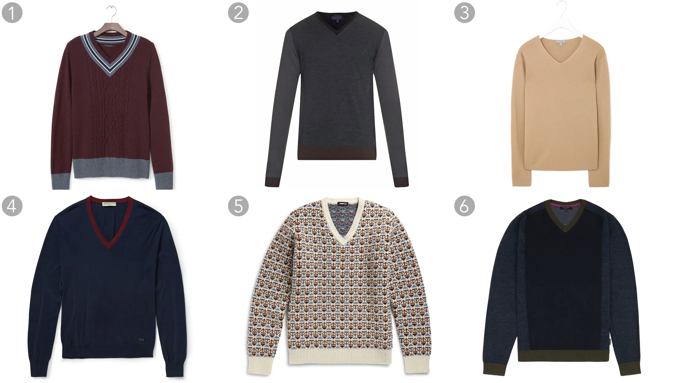 (1) 板球V领套头衫,香蕉共和国,$98.50,bananarepublic.com;(2) 彩色拼接羊毛针织毛衣,兰文,$595,matchesfashion.com;(3) 干净的V领毛衣,COS,$105,cosstores.com;(4) 丝绸和棉混纺毛衣,博柏利伦敦,$650,mrporter.com;(5) 羊毛提花毛衣,拉夫·西蒙斯,$745,mrporter.com;(6) 彩色拼接V领毛衣,泰德·贝克,$165,tedbaker.com。
