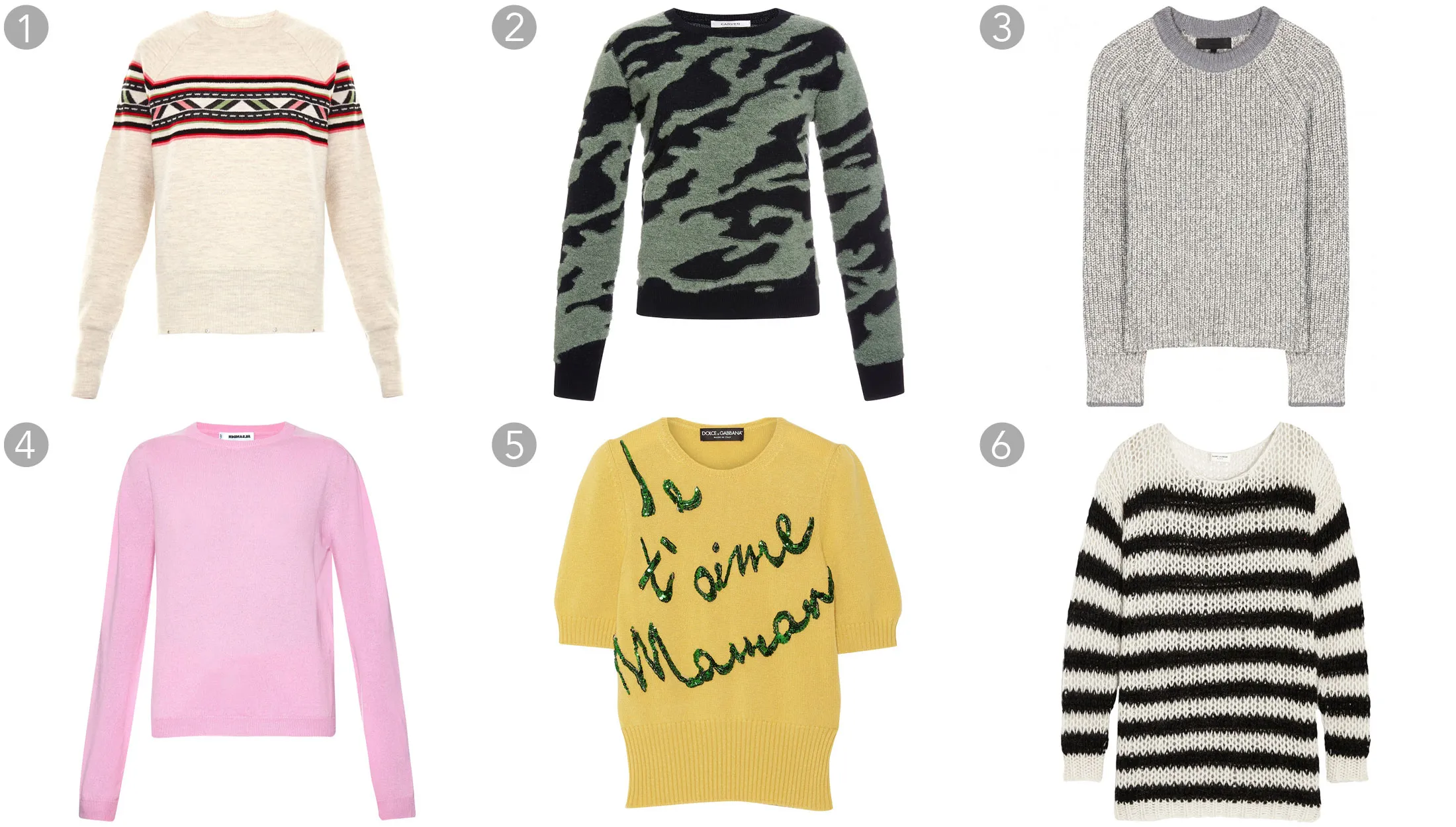(1) 布莱克部落条纹羊毛混纺毛衣,伊莎贝尔·玛兰,$640,matchesfashion.com; (2) 迷彩提花毛衣,卡尔文,$650,modaoperandi.com; (3) 卡伦羊毛混纺毛衣,拉格与骨,$322,mytheresa.com; **(4)**开衫羊绒毛衣,吉尔·桑德,$726,matchesfashion.com; (5) 装饰羊绒毛衣,杜嘉班纳,$1,995,net-a-porter.com; (6) 条纹羊毛混纺毛衣,圣罗兰,$1,190,net-a-porter.com。
