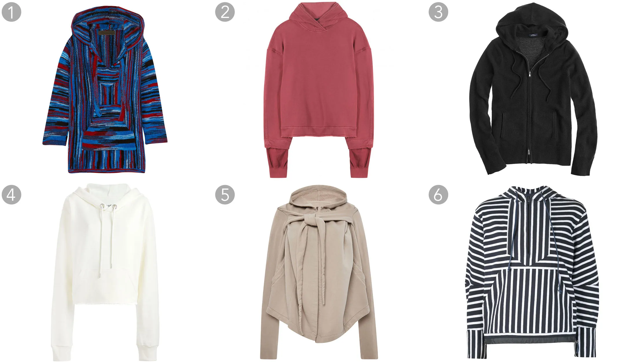 (1) 巴哈连帽羊绒毛衣,The Elder Statesman,$2,140,net-a-porter.com; (2) 棉质连帽衫,Haider Ackermann,$850,mytheresa.com; **(3)**羊绒拉链连帽衫,J.Crew,$238,jcrew.com; (4) 生边连帽衫,MM6 Maison Margiela,$270.87,farfetch.com; (5) 棉质绒面系带连帽衫,Rick Owens DRKSHDW,$790,modaoperandi.com; (6) 条纹连帽衫,Sacai,$530,farfetch.com.