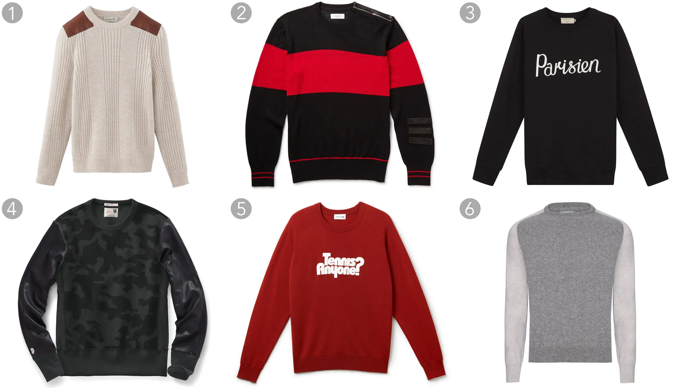(1) 意大利羊绒羊毛混纺毛衣,A.P.C.,$395,apc.fr; (2) 皮革装饰大胆条纹圆领毛衣,Ovadia & Sons,$295,ovadiaandsons.com; (3) “巴黎风”棉质卫衣,Maison Kitsune,$220,kitsune.fr; (4) 皮革反向编织卫衣,Todd Snyder,$198,toddsnyder.com; (5) “网球爱好者?”卫衣,Lacoste,$325, lacoste.com; (6) Palmer 羊毛针织,Orlebar Brown,$295,orlebarbrown.com。