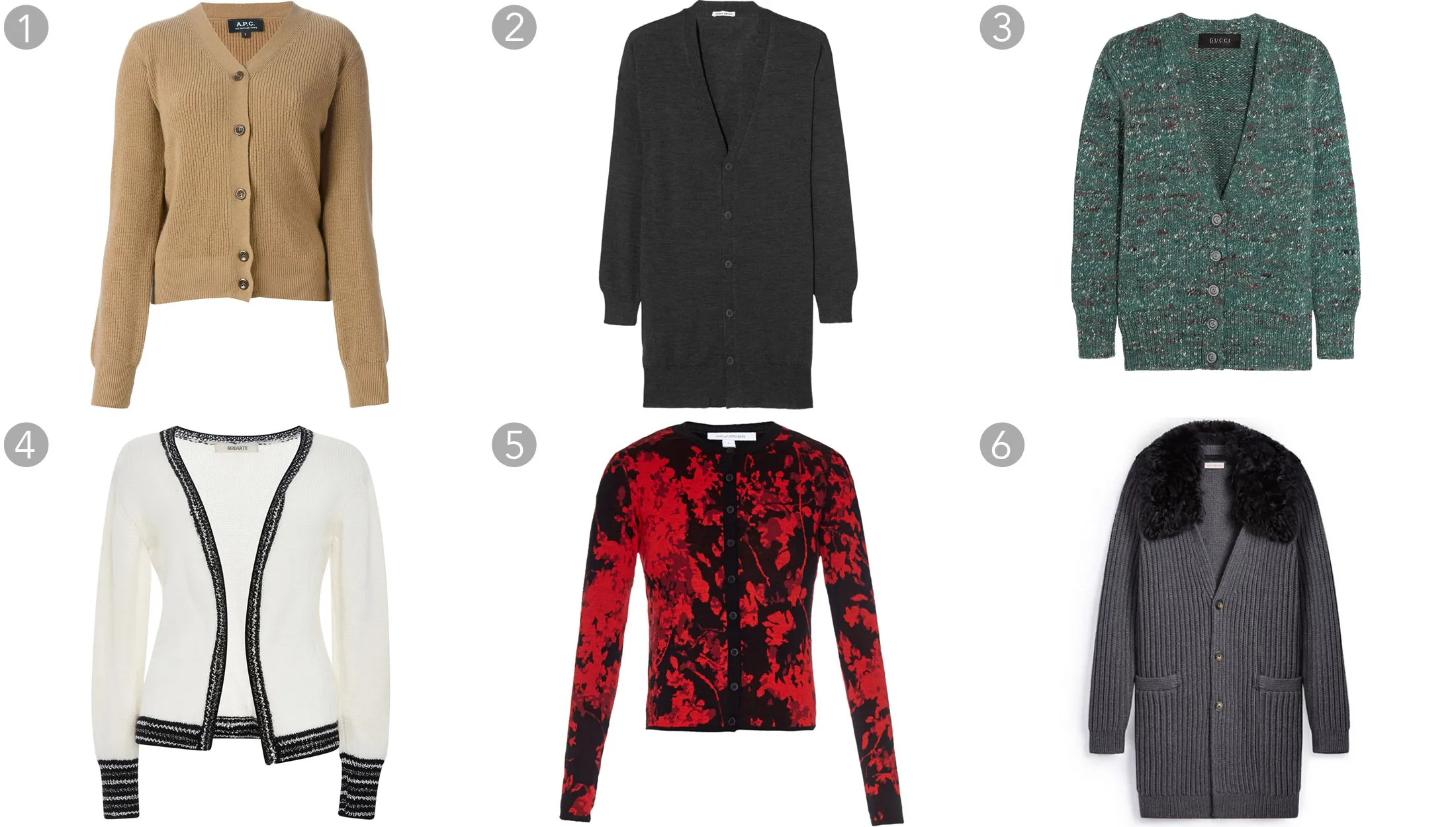 (1) 罗纹开衫,A.P.C.,$252.33,farfetch.com; (2) 美利奴羊毛开衫,Tomas Maier,$650,net-a-porter.com; (3) 混合羊毛开衫,Gucci,$1,400,net-a-porter.com; (4) 白色和金属色羊绒针织开衫,Rodarte,$2,300,modaoperandi.com; (5) 新伊比萨美利奴羊毛开衫,Diane von Furstenberg,$298,matchesfashion.com; (6) 羊毛毛皮装饰开衫,Tory Burch,$795,toryburch.com。