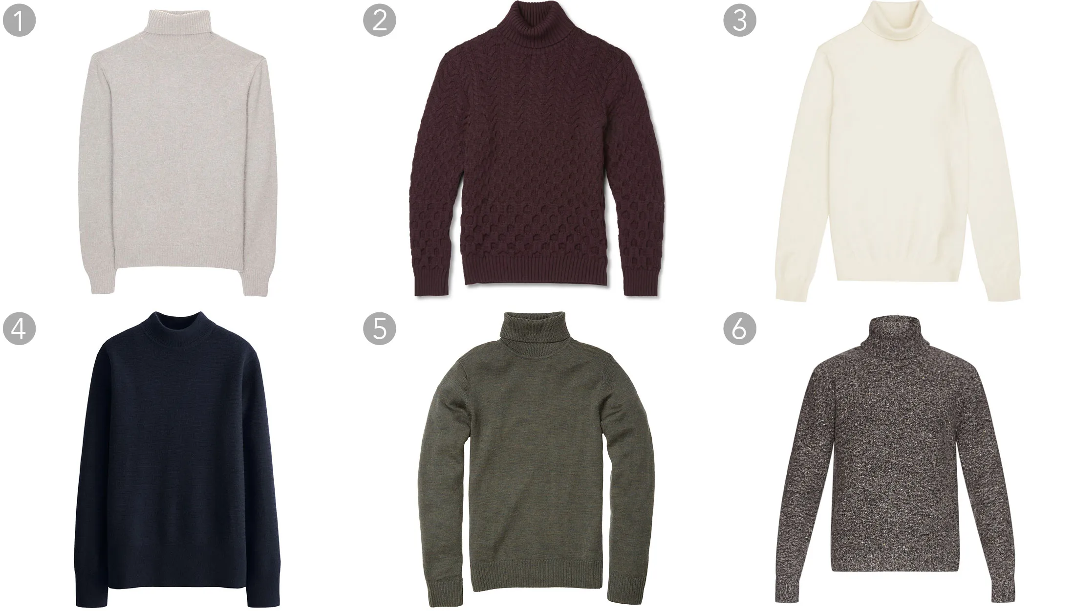(1) 羊毛高领毛衣,Ami,$315,amipari.fr; (2) 修身款缆绳针织高领毛衣,Etro,$670,mrporter.com; (3) 开司米高领毛衣,Reiss,$370,[reiss.com](https://www.reiss.com/us/p/cashmere-rollneck-jumper-mens-blackjack-in-off-white/? category_id=1112); (4) 美利奴混纺假领高领毛衣,Lemaire x Uniqlo,$49.90,uniqlo.com; (5) 粗针高领毛衣,Bonobos,$118,bonobos.com; (6) 花纹羊毛和开司米混纺毛衣,Valentino,$1,100,matchesfashion.com。