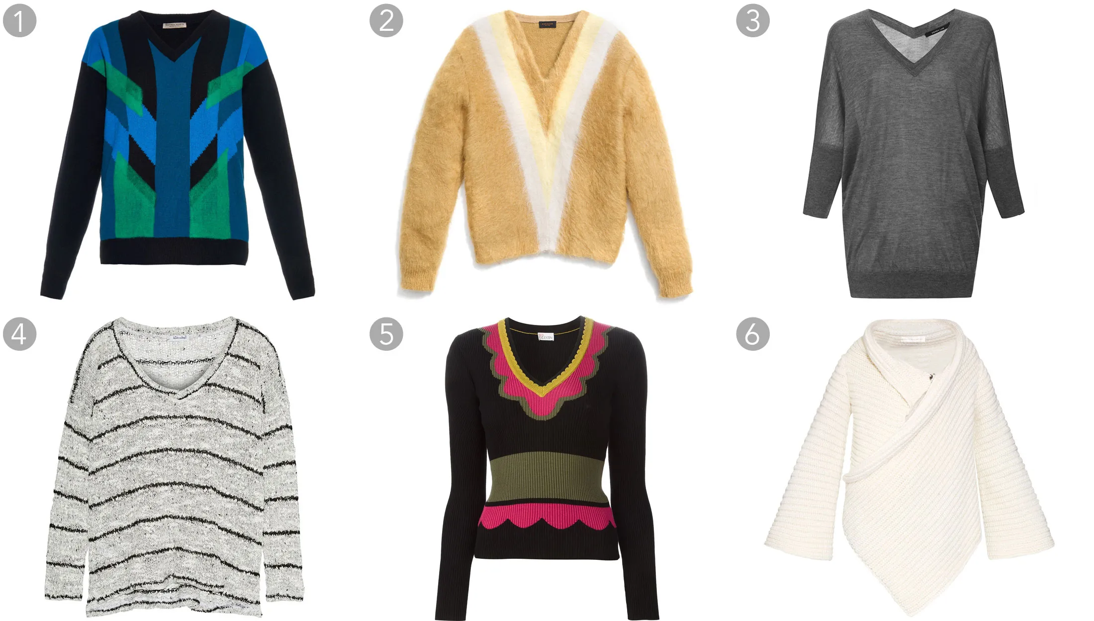 (1) 彩色拼接羊绒针织毛衣,Bottega Veneta,$1,700,matchesfashion.com; (2) 彩色拼接V领毛衣,Coach,$395,coach.com; (3) 丝绸和羊绒蝙蝠袖毛衣,Derek Lam,$650,modaoperandi.com; (4) Broome条纹针织毛衣,Splendid,$150,net-a-porter.com; (5) 罗纹V领毛衣,Red Valentino,$495,farfetch.com; (6) 粗针织羊毛混纺开衫,Stella McCartney,$918,matchesfashion.com.