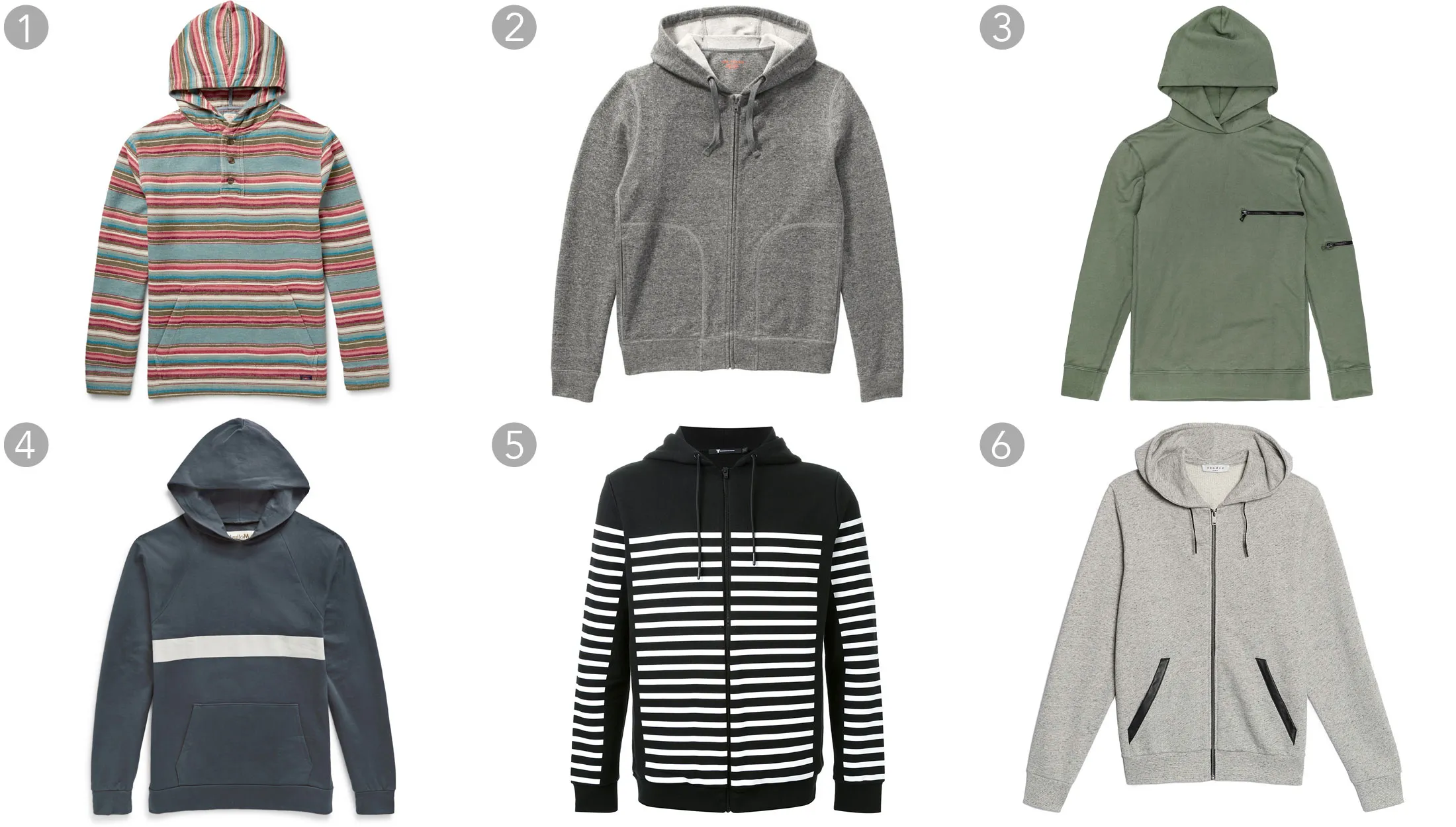 (1) 条纹刷棉连帽衫,Faherty,$245,mrporter.com;(2) 浅灰色连帽衫,Joe Fresh,$49,joefresh.com;(3) 连帽冲突,John Elliott + Co.,$228,johnelliott.co;(4) 印花棉质针织连帽衫,Mollusk,$75,mrporter.com;(5) 条纹连帽衫,T by Alexander Wang,$405.45,farfetch.com;(6) 连帽开衫,Sandro,$325,sandro-paris.com。