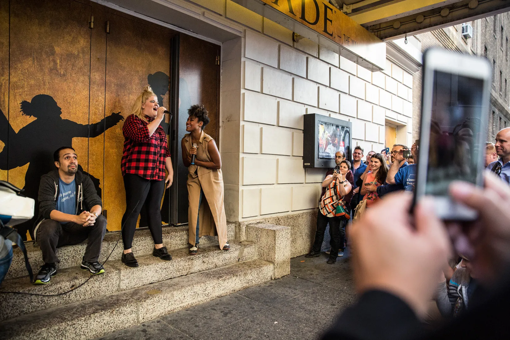 汉密尔顿的管理层预计在7月13日百老汇预演开始时,剧院外会有200到300人参加10美元的票务抽奖;结果大约有704人出现。“我们没有为此做好准备,”助理公司经理凯特琳·法恩说,“但那种能量是难以置信的。”米兰达被如此庞大的观众人数所感动,感谢了人群。在几天内,他的这一举动演变成了街头表演。与剧组成员一起,他展示了剧中的片段或任何表演者想要做的事情。