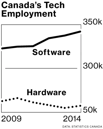 摄影师:Kevin Van Paassen/Bloomberg加拿大的大型科技公司曾经是硬件制造商,但那个时代已经结束。诺基亚,曾经是电信和网络设备巨头,已成往事,而黑莓的手机则成为濒危物种。从2009年诺基亚申请破产保护,到2014年几乎一半的黑莓8500万用户放弃手机,加拿大的硬件行业规模下降了20%,降至72100个工作岗位,根据该国的统计局数据。