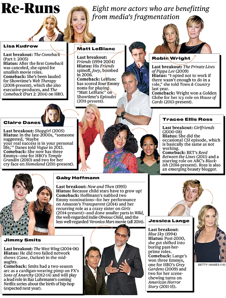 在以前的时代,这些演员可能会完全消失,但现在娱乐内容过剩,工作机会多得很。在他今年向电视评论协会的演讲中,FX 首席执行官 John Landgraf 揭示了他的网络所做的研究,显示原创剧本系列的数量从2009年的211部增长到2014年的371部,增长了75%,部分原因是亚马逊、Netflix、Hulu 和其他新内容创作者的出现。截至8月初,正在播出的原创节目有267部——这还是在秋季系列首播之前。Landgraf 的团队预测,到年底这个数字将超过400。同样,根据 Box Office Mojo,2014年上映的电影数量比2009年增加了135%。