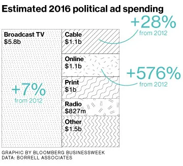 根据NCC媒体的说法,在2014年中期选举中,共和党候选人的广告购买者将地方有线电视上的政治广告数量提高了近75%,相比于2010年中期选举。HGTV、FX和食品网络等频道突然被竞选信息淹没。“我绝对将其归因于电视广告背后更好的分析,”NCC的政治战略总监蒂莫西·凯说。“Rentrak数据的一个优点是,它为我们传统上没有看到评级的网络提供了评级,因为其他媒体调查公司显示的样本量很小。”
