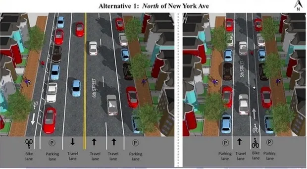 6街走廊的提议自行车道替代方案。尚未选择最终设计。DDOT在给DDOT的信中,教堂称6街走廊“对交通和停车特别有问题,因此不是自行车道/轨道的好位置。”它继续说道: