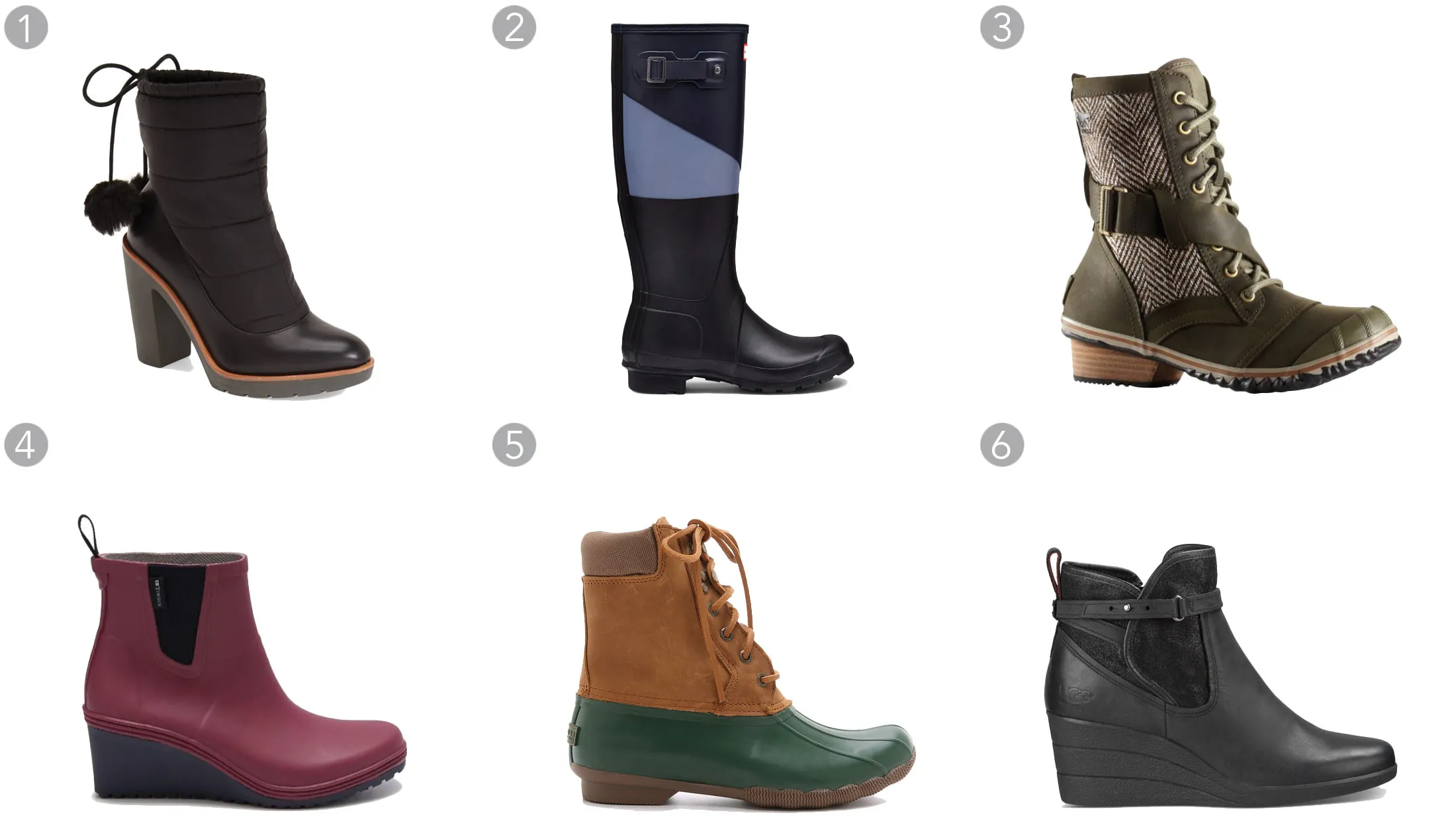 (1) 绗缝Ginnie靴子,Kate Spade New York,$368,nordstrom.com; (2) 不对称拼色雨靴,Hunter,$195,hunterboots.com; (3) 人字纹Slimboot,Sorel,$150,sorel.com; (4) 橡胶坡跟靴,Tretorn,$100,tretorn.com; (5) Shearwater绒毛衬里的靴子,Sperry,$140,shopbop.com; (6) Emalie坡跟靴子,UGG Australia,$150,uggaustralia.com。