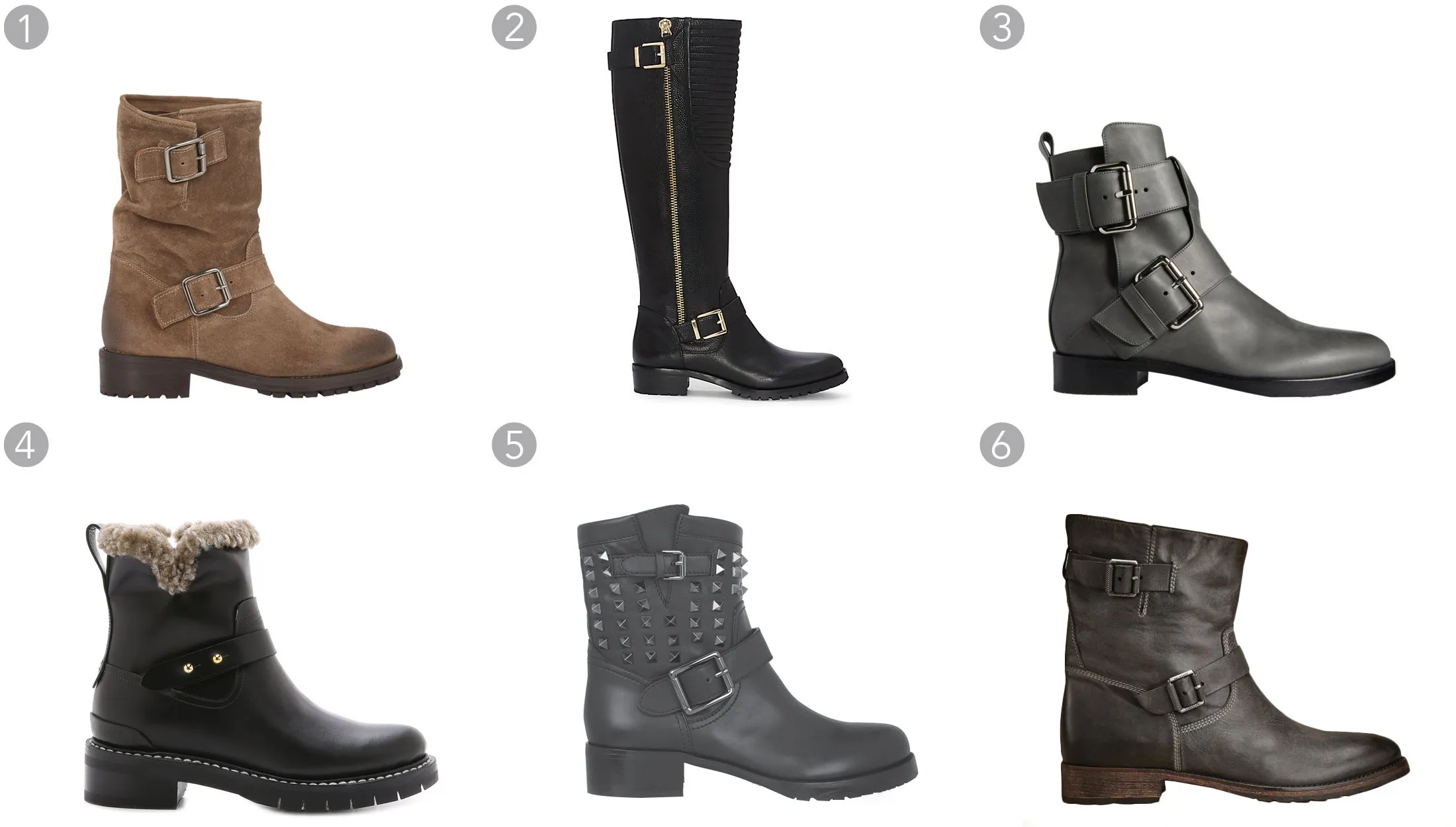 (1) 麂皮摩托靴,Barneys New York,$385,barneys.com;(2) 绗缝高筒摩托靴,Vince Camuto,$239,vincecamuto.com;(3) 双扣摩托靴,Pierre Hardy,$1,295,barneys.com;(4) 羊毛衬里的摩托靴,Rag & Bone,$695,shopbop.com;(5) 铆钉皮革骑士靴,Valentino,$1,495,net-a-porter.com;(6) Bedfordshire手蜡皮靴,Belstaff,$795,belstaff.com。