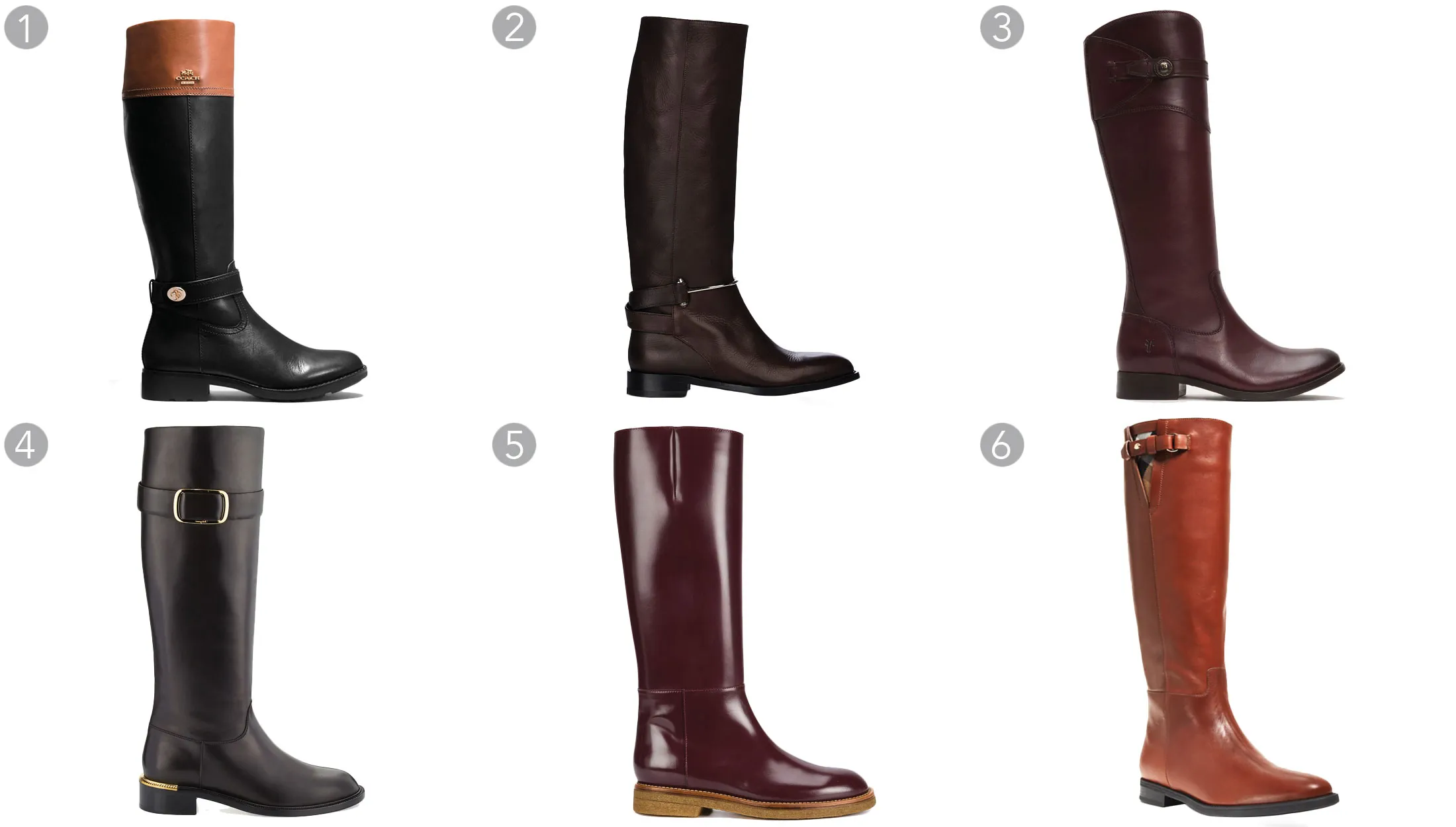 (1) 伊娃皮革靴,Coach,$395,coach.com;(2) 穿孔皮革靴,Balenciaga,$1,375,barneys.com;(3) 莫莉扣高筒皮革靴,Frye,$398,thefryecompany.com;(4) 小牛皮骑行靴,Salvatore Ferragamo,$1,290,neimanmarcus.com;(5) Vitello皮革骑行靴,Marni,$1,220,farfetch.com;(6) 带扣皮革骑行靴,Burberry,$895,bloomingdales.com。