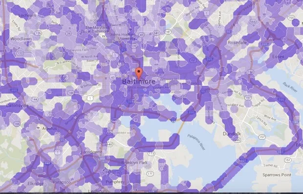 让我们用一个 地图 来说明这一点,来自 Sensorly.com 的巴尔的摩地区,显示了“Hotline Bling”的信号盲区——较暗的区域是信号最好的地方,而较亮的区域则是信号最差的地方。这就是你搬到安妮阿伦德尔县所得到的。