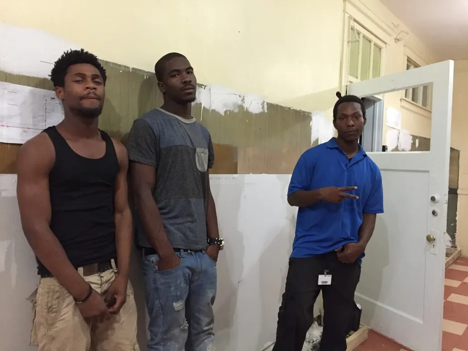 在乌吉马村,储物柜即将安装,从左到右:克里斯蒂安·霍尔、迈克尔·布朗和冥王星梅吉·卡里德斯“你不想在面试时带着[包],所以我就把它们放下了,”他说。“就在巷子里。或者我会把它们藏在灌木丛下。回来时发现有人拿走了。我就这样失去了很多衣服。”