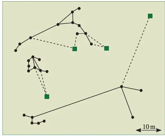 肉蚁运输系统的示例,圆圈表示巢穴,绿色方块表示树木。虚线表示直接连接到树木的小径。皇家学会界面期刊一个全球学者团队最近开始研究这些蚁群如何在没有任何集中规划操作的情况下,以精简的预算创建如此高效的运输网络。基于对肉蚁小径的先前研究,研究人员模拟了这些网络是如何演变的。(他们似乎已经排除了任何现有的城市规划 中心为蚂蚁。)在 皇家学会界面期刊中,研究团队 报告他们识别出了支配这一规划系统的基本“规则”。