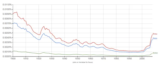 例如,“你”、“你”和“你的”这些词。下面的Ngram图表显示,这些词自2000年以来一直在上升。如果你仔细观察,你会发现“你”在2008年的受欢迎程度与1930年大致相同。