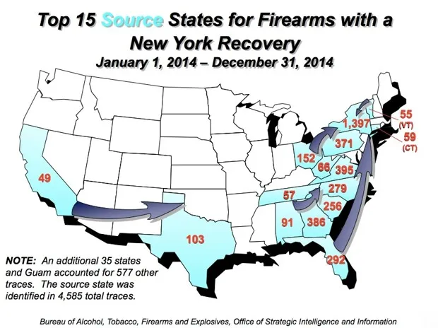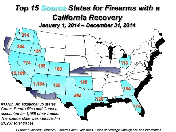 对于伊利诺伊州,大约一半的追踪到的枪支来自外州,几乎所有这些枪支都来自没有要求背景调查的州。由ATF在伊利诺伊州追踪到的绝大多数枪支,毫无疑问,最终出现在芝加哥:
