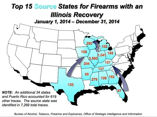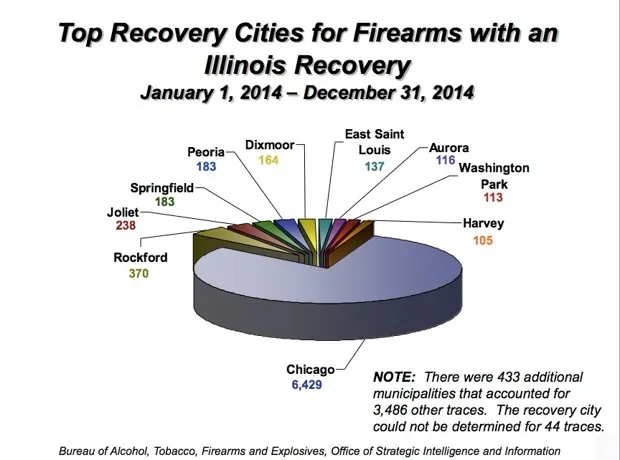 对于伊利诺伊州,大约一半的追踪到的枪支来自外州,几乎所有这些枪支都来自没有要求背景调查的州。由ATF在伊利诺伊州追踪到的绝大多数枪支,毫无疑问,最终出现在芝加哥: