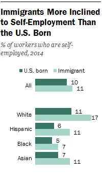 外籍工人比美国出生的工人稍微更有可能在独立的营利性企业中自雇。2014年,移民占美国1460万自雇工人的相当一部分(19%)。 (作为背景:外籍工人约占美国劳动力的17%,并且通常比美国出生的工人更有可能就业,按照劳工统计局的说法。)