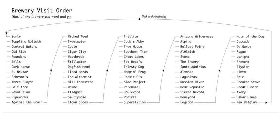 使用 一种算法,Lau计算了美国70家最佳酿酒厂的最短路线,并得出了以下顺序: