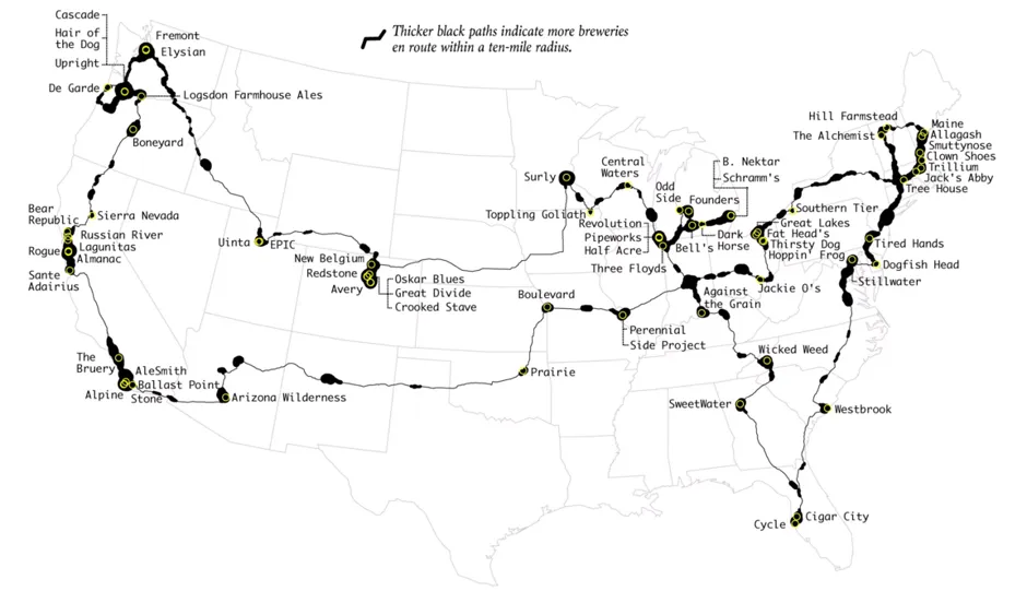 附带的地图标记了穿越全国最佳酿酒厂的最佳路线。但对于那些喜欢偏离常规的人,Lau还强调了在这些地区10英里半径内你会找到其他酿酒厂的地方,通过加粗这些区域的路径来表示: