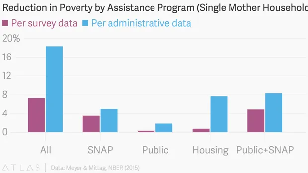 虽然基于收入的贫困测量一直在改善,但它们仍然依赖于美国人口普查局通过其当前人口调查获得的数据——根据芝加哥大学经济学家布鲁斯·D·迈耶和尼古拉斯·米塔格的新论文,这些数据充满了不准确性。为了展示这些扭曲的数据如何影响我们对贫困和政府援助项目的理解,研究人员比较了人们向人口普查报告(或在这种情况下,错误报告)的贫困快照与使用政府实际援助记录创建的快照。