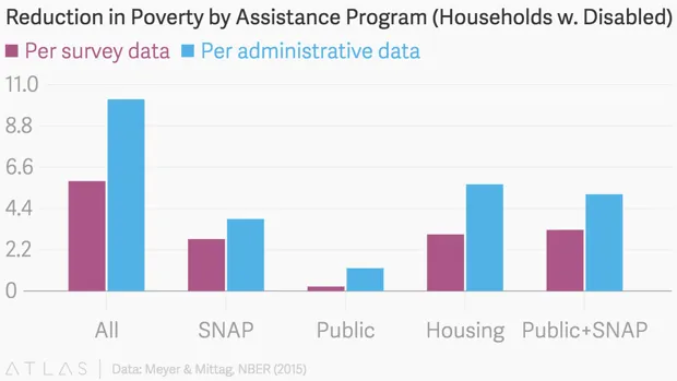 对于有单身母亲和残疾家庭成员的家庭,行政数据和调查数据之间的差异尤其明显。正如下面的第一张图表所示,根据行政数据,援助项目使残疾成员家庭的贫困率减少了10.2个百分点,而根据调查数据则减少了5.8个百分点: