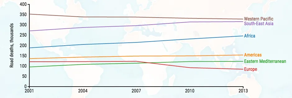 现在,来自世界卫生组织的今年的报告关于全球道路死亡的状态。根据每个参与国自身交通管理部门的数据,世卫组织得出结论,2013年全球约有125万人在道路上死亡**。**大约占地球总人口的0.018%,这个数字听起来很小,但交通事故是15至29岁年轻人死亡的主要原因。