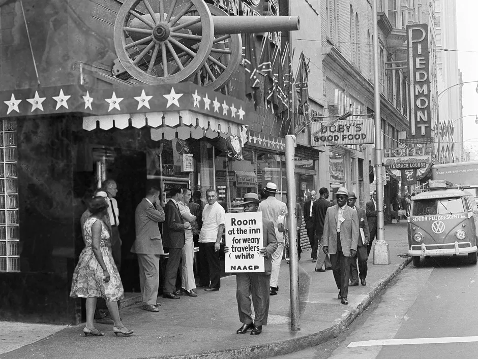 1962年,在亚特兰大一家拒绝为非裔美国人服务的餐厅外,一名抗议者。美联社照片/霍勒斯·科特在吉姆·克劳时代,非裔美国人旅行如你所想,十分困难。种族隔离法 限制了对 餐厅、交通、酒店、商店和医院的进入。在南方,“黑人法典 针对非裔美国人(居民或游客)进行 闲逛。在许多城镇,如果黑人旅行者在日落后逗留,他们会遭遇 不可想象的暴力甚至死亡。