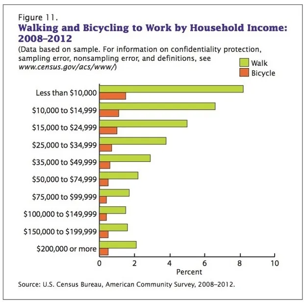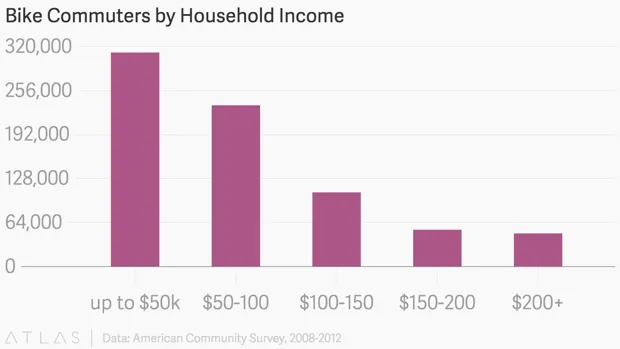 基茨说得对,低收入家庭构成了所有骑行者的主体,尽管他错过了一些最有力的证据。2008年至2012年的美国社区调查(也 编制 在 美国通勤,2013) 详细分析 工作人口中按家庭收入划分的自行车出行。低收入家庭骑自行车上班的比例高于高收入家庭: