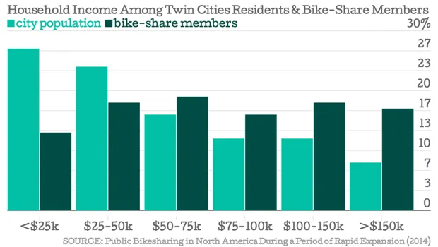 与此同时,苏珊·沙欣和一些合作者在去年秋季为米内塔报告分析的自行车共享使用数据揭示了一个非常不同的情况。在这里我们看到在几个北美城市中,高收入居民在自行车共享成员中占比过高,而低收入家庭则占比不足。以下是双城的数据:
