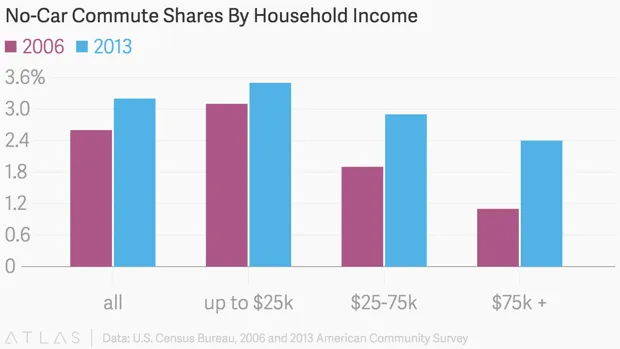 关于没有汽车的工人的新数据,由美国人口普查局的布赖恩·麦肯齐整理,提供了更全面的情况。从2006年到2013年,所有无车骑自行车通勤者的比例从2.6%上升到3.2%。但低收入(最高$25,000)比例从3.1%小幅上升到3.5%,而高收入(超过$75,000)比例则翻了一番,从1.1%上升到2.4%。
