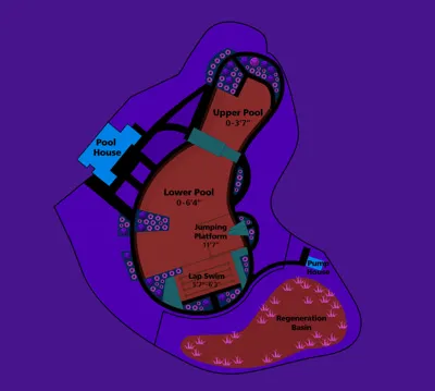这个面积为21,000平方英尺、耗资700万美元的游泳池于7月开放,设有一个浅水区和一个更深的游泳区,两个区域都有倾斜的零深度入口,还有四条游泳道和一个仿木跳水平台。景观设计很简单,只有几棵树和灌木,以及一些可以坐的巨石。设施很少:没有饮料或更衣室,只有露天淋浴。水面呈现出绿色的色调。