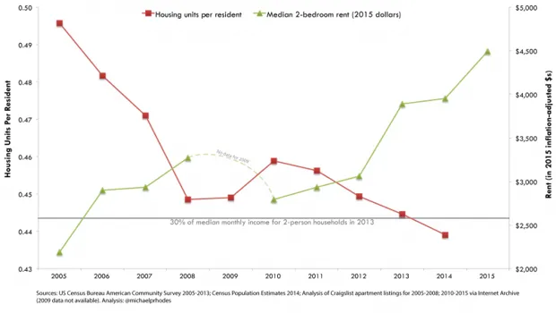 但正如CityLab之前指出的那样,新开发从来不是使命区的问题。自2000年以来,该邻里每年新增的单元少于100个。如果说有什么问题,那就是缺乏开发正在将长期居民推走——全市的供给无法满足需求。正如我的同事克里斯顿·卡普斯所说,旧金山正处于住房干旱中。这让我想到……