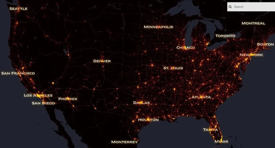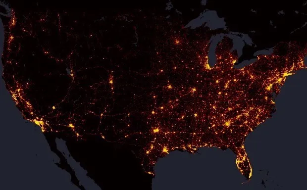 在国家层面上,加尔卡的地图几乎看起来像是横跨美国道路网络的电网——在城市地区有明亮的橙色集群,通过偏远地区的暗红色线条连接。这里是整个国家的宽视图: