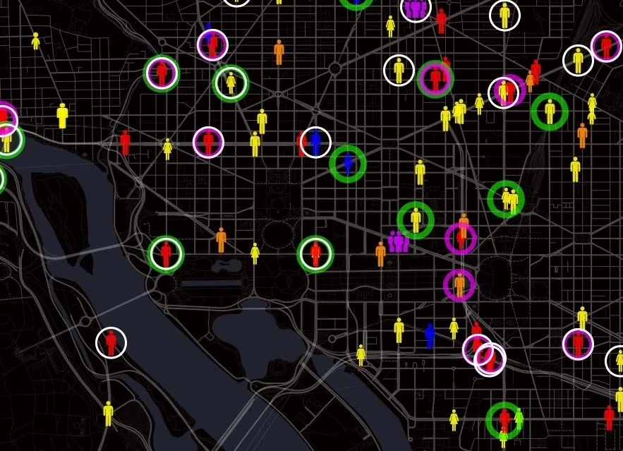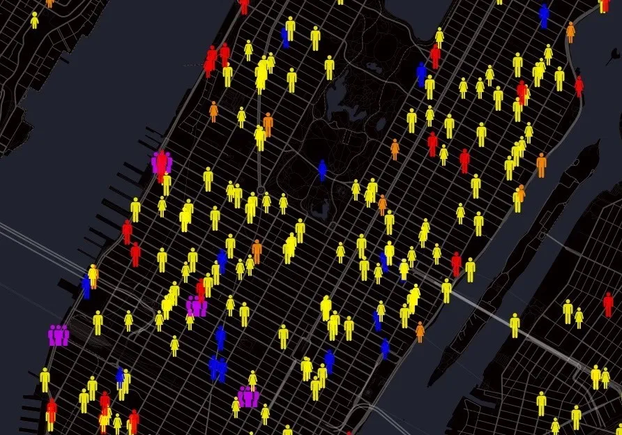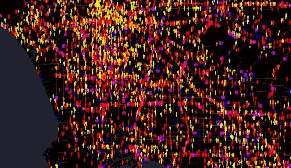当你放大到更地方的视角时,点开始呈现出女性、男性和儿童的形状。不同的颜色代表司机(红色)、乘客(橙色)、行人(黄色)、骑自行车的人(蓝色)和团体(紫色)。这里是洛杉矶都市区的更近视图: