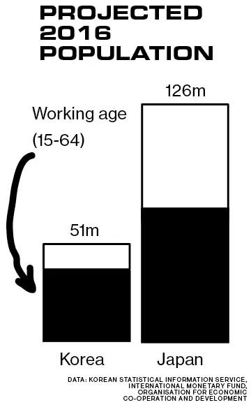 老龄化人口将阻碍韩国政府振兴疲软经济的努力,该经济受到出口放缓和国内需求疲软的困扰。 “这确实降低了潜在的增长率,”汇丰银行驻香港的经济学家约瑟夫·因卡尔卡特拉说。去年的一份议会报告称,国内生产总值将在2014年至2018年间平均增长3.6%。但人口变化将使这一目标难以实现。因卡尔卡特拉表示,国内需求约占GDP的一半,韩国人必须面对劳动力减少对消费的影响。