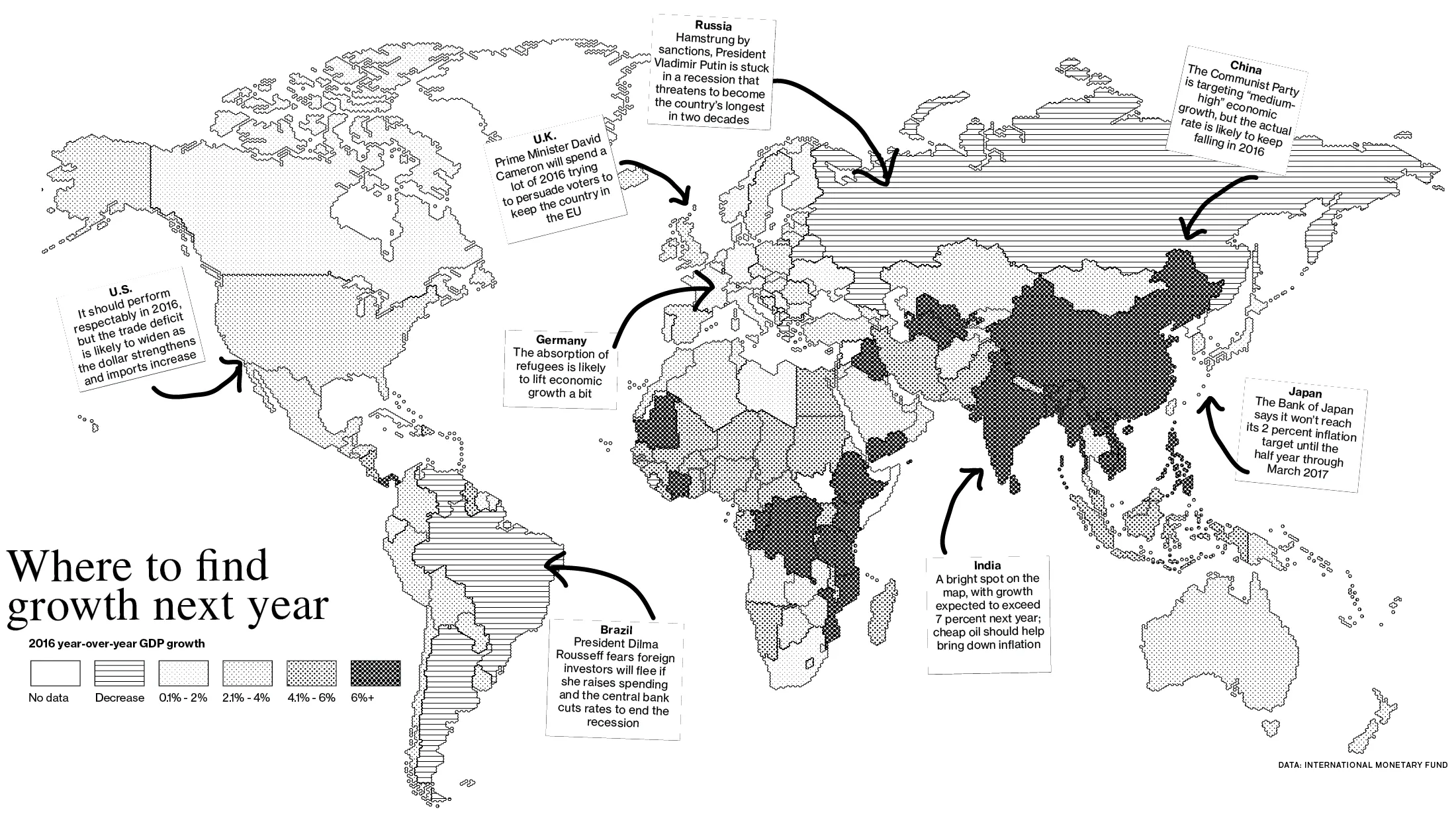 对于巴西(政治危机,石油)和俄罗斯(制裁,石油)来说,这一年可谓是艰难的一年。国际货币基金组织预计这两个国家的经济在2016年将继续萎缩,但不会如此迅速。预计明年没有其他主要经济体会陷入衰退。国际货币基金组织预计印度将再次超过中国,略微加速至7.5%的增长,而墨西哥增长2.8%,尼日利亚扩张4.3%,南非的产出仅勉强增长1.3%。