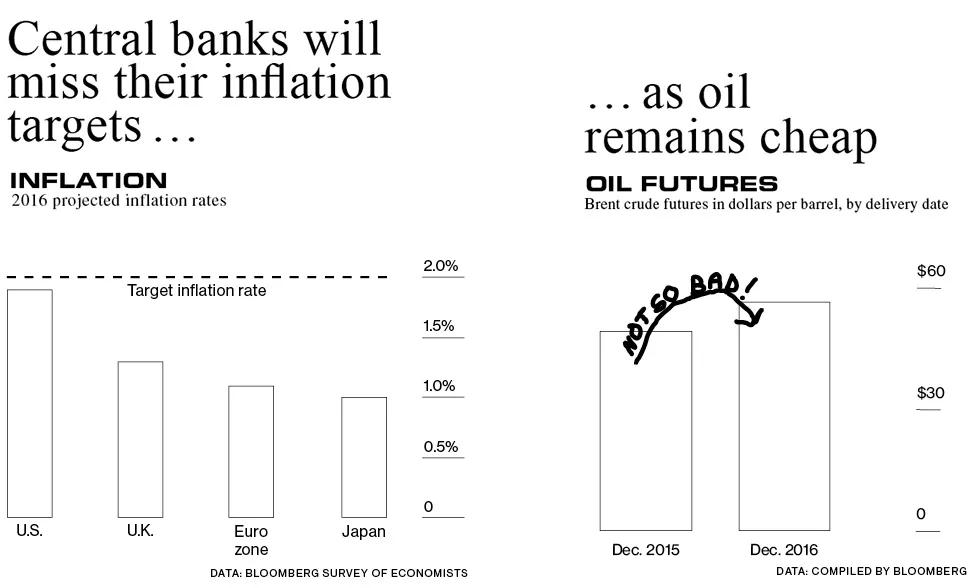 这里是主流观点的简要概述:中国将继续减速。美国将继续超越其富裕国家的同行。由于全球需求疲软,货币的价格(利率)以及石油和其他商品的价格可能会保持低位。中央银行行长珍妮特·耶伦、马里奥·德拉吉和黑田东彦将成为焦点,因为美联储试图提高利率,而欧洲中央银行和日本银行则寻找刺激增长的方法。