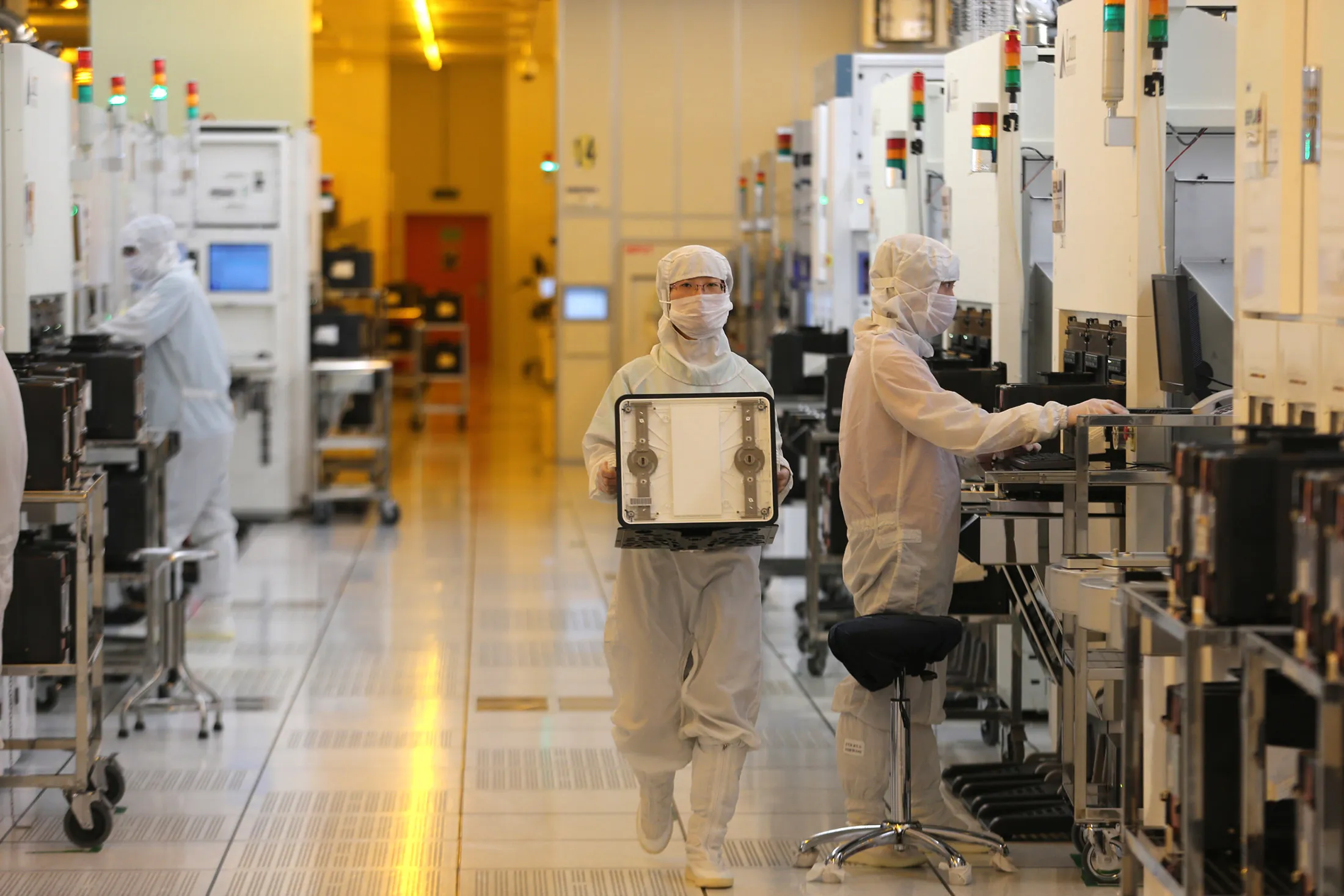 员工穿着防尘服在北京的半导体制造国际公司的工厂工作。