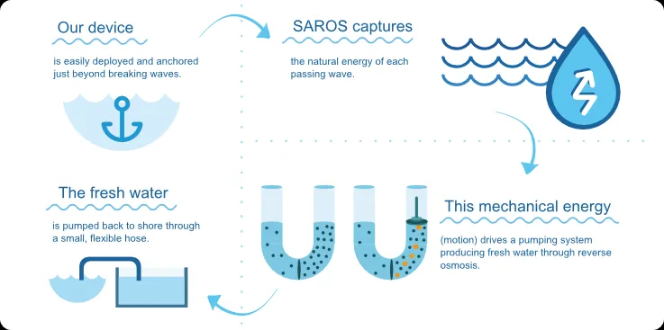 但尽管许多公司正在利用波浪能产生电力(例如,这通常用于为附近的海水淡化厂供电),SAROS表示它是唯一一家直接生产清水的公司——这使得水更便宜,系统更高效。