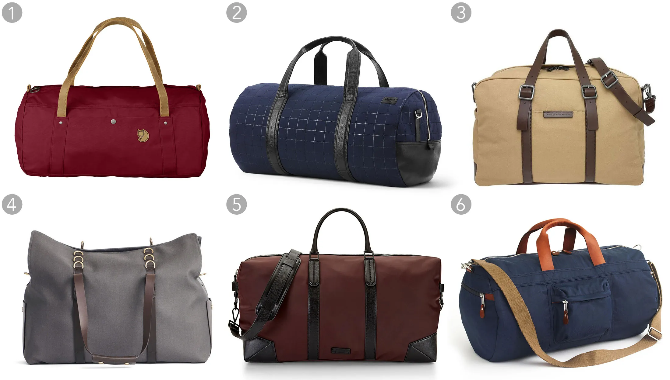 (1) Duffel No. 4 大号,Fjallraven $170,fjallraven.com; (2) 绗缝科技尼龙旅行袋,Jack Spade $328,jackspade.com; (3) 经典帆布周末包,Marc by Marc Jacobs $428,marcjacobs.com; (4) M/S 供应包,Mismo $632.42,mismo.dk; (5) Wythe 周末包,Uri Minkoff $425,uriminkoff.com; (6) Harwick 旅行袋,J.Crew $98,jcrew.com