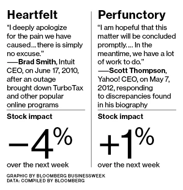 当雅虎首席执行官Scott Thompson在2012年为他的简历中的不一致道歉时,他的声明承担了他造成的干扰的责任,而不是错误,并承诺“继续向前走”。教授们给他的道歉打了零分。尽管Thompson最终辞职,但股票在此后几天上涨。