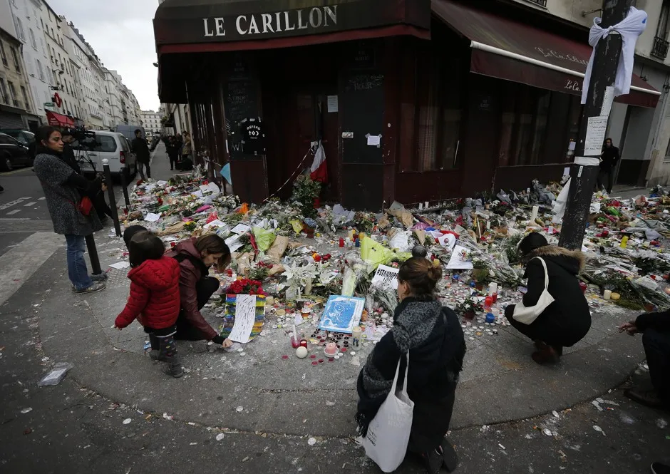 我们坐在Petit Cambodge餐厅和Carillon酒吧的拐角处,那里至少有12人在周五晚上被枪杀。现场堆满了鲜花和蜡烛,周围是一群沉默或相拥而泣的人。然而,离这里不到100英尺的咖啡馆露台上,顾客们却在聊天和欢笑,显然玩得很开心。