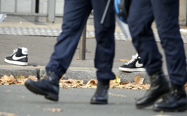 警方经过在巴塔克兰音乐厅附近街道上看到的一双被遗弃的鞋子。查尔斯·普拉蒂厄 / 路透社)更新于晚上7:20。