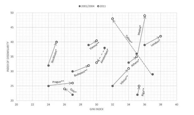 这两者都在增长的经济隔离和不平等的趋势中的三个例外是塔林和奥斯陆——经济隔离增长,但不平等没有增长——以及阿姆斯特丹,在2001年至2011年间经济隔离有所下降, 部分由于 中产阶级家庭搬出相对便宜的社会住房单位。因此,虽然经济隔离和不平等往往是一起出现的,但并不总是如此。例如,斯德哥尔摩结合了高水平的经济隔离和相对较低水平的不平等。